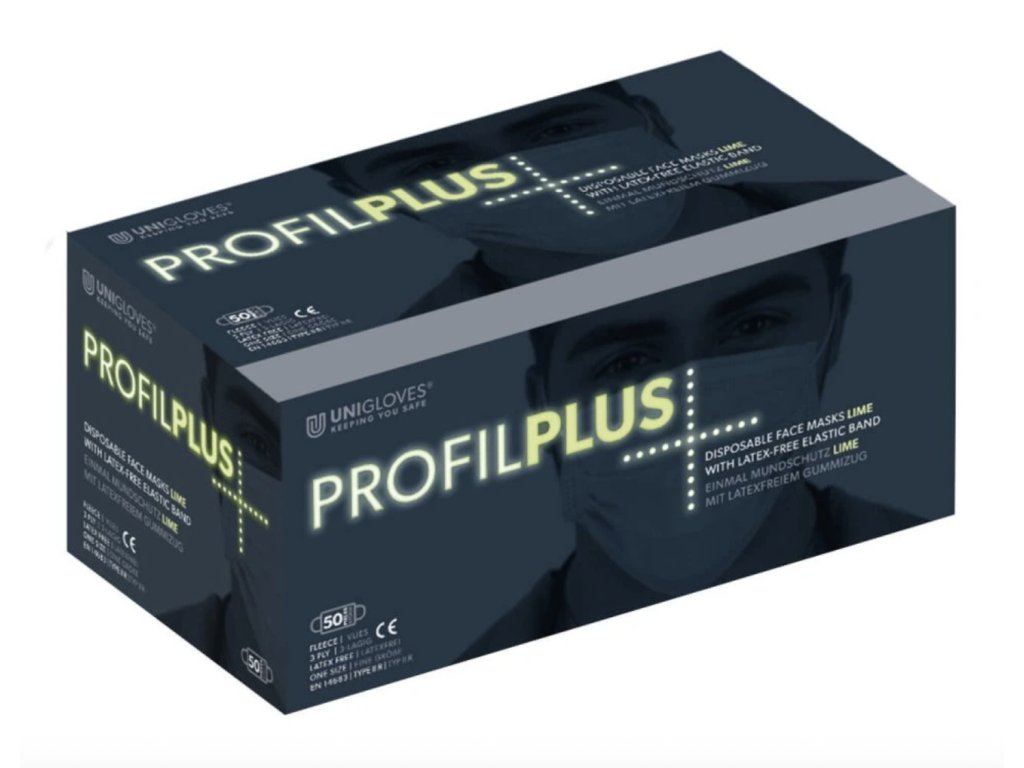 Lime trojvrstvové rúška Profil Plus od značky UNIGLOVES poskytujú spoľahlivú ochranu dýchacích ciest pri každodennom profesionálnom používaní.